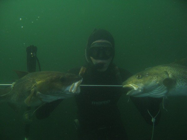 Med den nye torsk mellem benene svømmer jeg akavet op mod overfladen, hvor Knud med store øjne følger mig mens jeg kommer op mod ham. Torskene vejede henholdsvis 5.7kg og 9.5kg, og den sidstnævnte (som jeg ikke havde set da jeg skød på torsk nummer ét) blev den største torsk fanget i Danmark i 2010.
